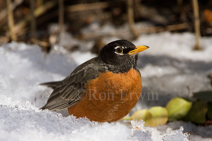 That's what my sister said when she saw these American robin pictures (right and below) Ron took at the end of March. It was one week after the first official day of Spring but the snow banks were still high in our neighbourhood making it hard to believe that it really WAS Spring. Some years a few robins even over-winter in the Bluffs. Migrants started arriving in Toronto a few weeks earlier but were yet to appear in my sister's area of Northern Ontario. These robins were just two of about a dozen frantically gobbling up last-year's fruit both under and in three ornamental crab trees. The robin below seems unimpressed with the snow. But the robins weren't alone in their feeding frenzy nor were they what drew us to shoot at that location. We subscribe to ONTBIRDS a free email service provided by the Ontario Field Ornithologists (OFO) were birders share their sightings of interesting birds. On this sunny day it was a report of Bohemian Waxwings that enticed us out to the crab trees. Neither of us had ever even seen that bird species - let alone photographed them! As we were leaving our house we noticed a small flock of Cedar Waxwings (above and right) high up in the trees in ours and the neighbouring front yard. Since Cedar and Bohemian Waxwings are often seen together (just not by us), we watched them carefully with binoculars to be sure that there weren't any Bohemian's amongst them. No luck, so off we went to the reported location. When we arrived the robins and some starlings were the first birds we spotted. But in a few minutes a flock of Cedar Waxwings flew into the trees. Ron of course was already shooting whatever bird decided to pose. As the birds flew in and out of the trees we soon realized that quietly and without fanfare the Cedar Waxwings had been joined by Bohemians. Our first sighting! (Below) For the next couple of hours Ron would photograph the birds as they fed and flew in and out of the trees. They seem to come in waves, sometimes being a mixture of bird species or sometimes just Bohemian waxwings alone. Mostly they seemed oblivious to us but occasionally one would cock its head wondering at the sound of Ron's camera as he clicked away. He gave them lots of space as he was shooting with a 500mm lens. But even at that distance they sometimes would fly by so close to him he could feel the wind from their wings. It was a lovely experience. We were also treated to our first Northern Mockingbird sighting of the year when it swooped in to participate in the crab-apple buffet. Ron didn't get any pictures but here are a few from last year. Now the snow has disappeared from our yard but I continue to monitor Spring's progress. A few days after we saw the waxwings my sister finally saw her first robin of the season and in ONTBIRDS they were reported further north in the Temiskaming District on April 3rd. I'm anticipating my first warbler sightings of the season. As early as Mar 2nd ONTBIRDS had reported sightings of yellow-rumped warblers in Ottawa, but they were only reported south at Point Pelee and near us in Whitby on April 8th. When I finally get to spot a warbler peeking out from apple blossoms like this yellow warbler that's when I'll know for sure that it's really Spring!